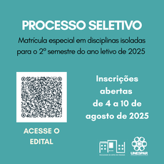 No período de 4 a 10 de agosto de 2025, estão abertas as inscrições para o Processo Seletivo para matrícula especial em disciplinas isoladas para o 2º semestre do ano letivo de 2025 do Campus de Curitiba II/FAP da Universidade Estadual do Paraná (Unespar).