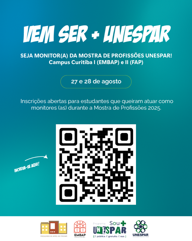 INSCRIÇÕES DE MONITORES PARA A MOSTRA DE PROFISSÕES UNESPAR - CAMPUS I E II (EMBAP e FAP) 27 E 28 DE AGOSTO VEM SER + UNESPAR