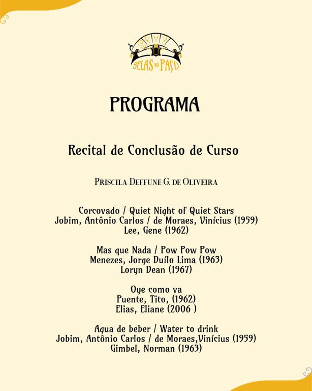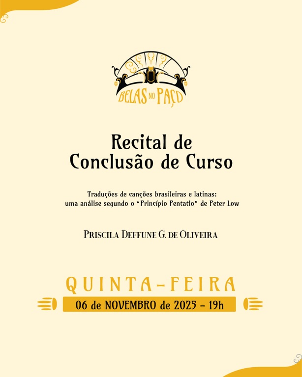 Você está aqui: Página Inicial > Notícias > 2025 > Novembro > Belas no Paço - Recital de Conclusão de Curso - Priscila Deffune G. de Oliveira