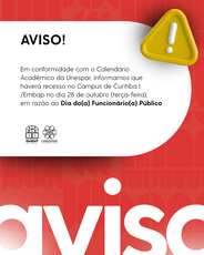 Em conformidade com o Calendário Acadêmico da Unespar, informamos que haverá recesso no Campus de Curitiba I/Embap no dia 28 de outubro (terça-feira), em razão da celebração do Dia do(a) Funcionário(a) Público.