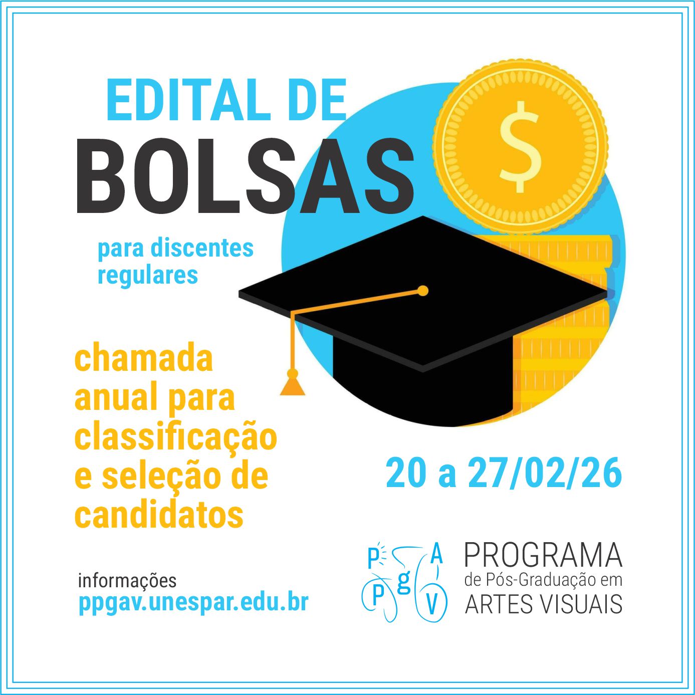O Programa de Pós-Graduação em Artes Visuais da Universidade Estadual do Paraná (PPGAV/UNESPAR), em parceria com o Instituto Confluir, torna pública a abertura do processo seletivo para concessão de 2 (duas) bolsas de mestrado destinadas a alunos(as) regulares do PPGAV. Inscrições até 10 de novembro 2025. Para saber mais, entre NESTE LINK ou acesse a aba "Vida Acadêmica" >> "Bolsas" no site do PPGAV.