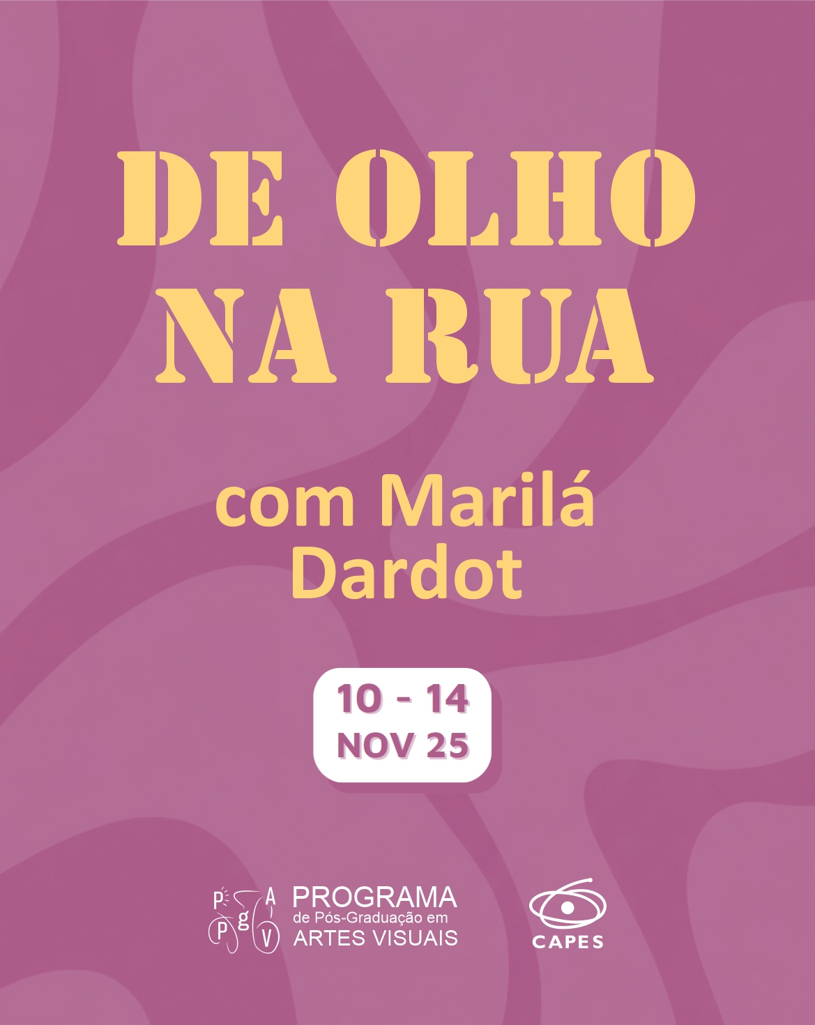 O Programa de Pós-Graduação em Artes Visuais da Universidade Estadual do Paraná (PPGAV/UNESPAR) em parceria com a III Jornada de Pesquisa do Bacharelado em Artes Visuais (BAV) convidam para a oficina "De Olho na Rua" com a artista Marilá Dardot. A mini oficina propõe aos interessados realizar, em pouco tempo e com o mínimo de recursos, uma ação/intervenção urbana nos arredores da faculdade. Partindo de uma deambulação pelo entorno, exercitar o olhar fresco e descentrado sobre o que há e acontece nas ruas para pensar e atuar nesse contexto.